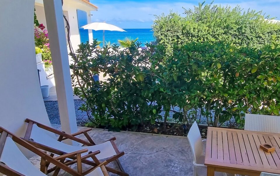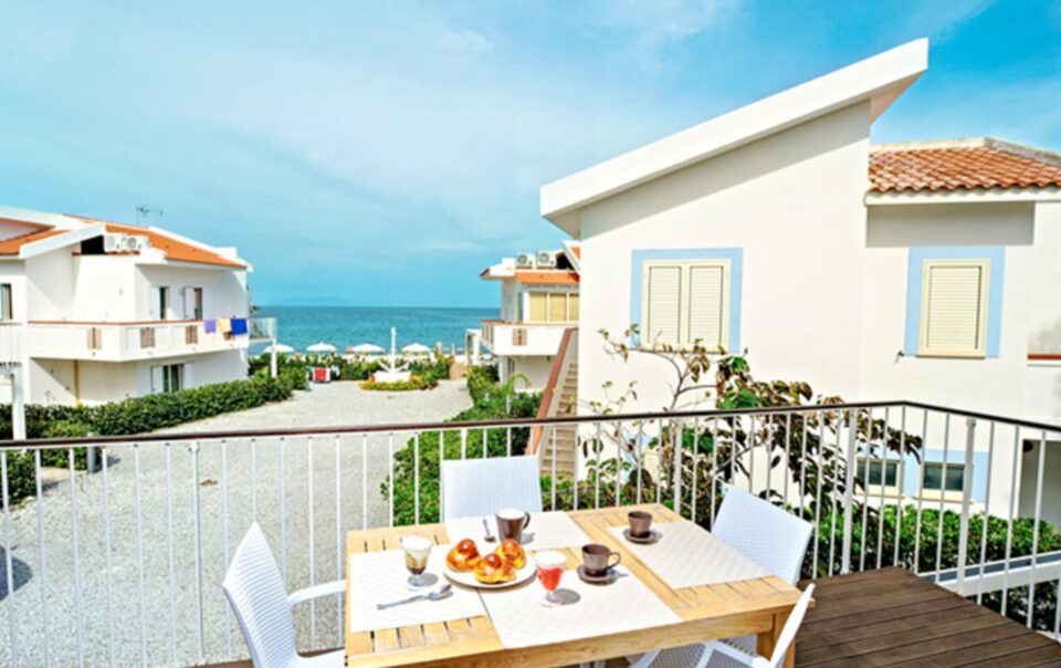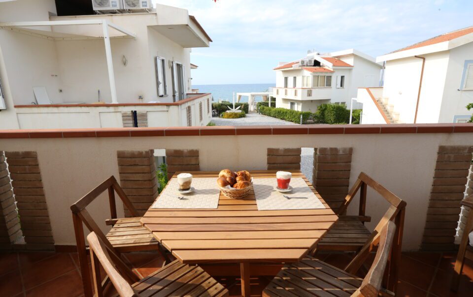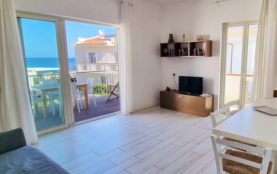 Trilocale con terrazza vista mare, una camera matrimoniale ed una camera con due letti singoli, un bagno, cucina soggiorno con divano letto matrimoniale.