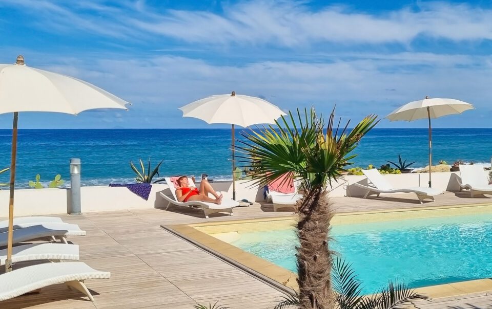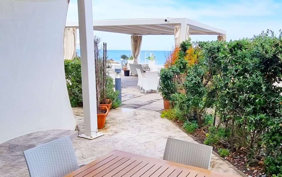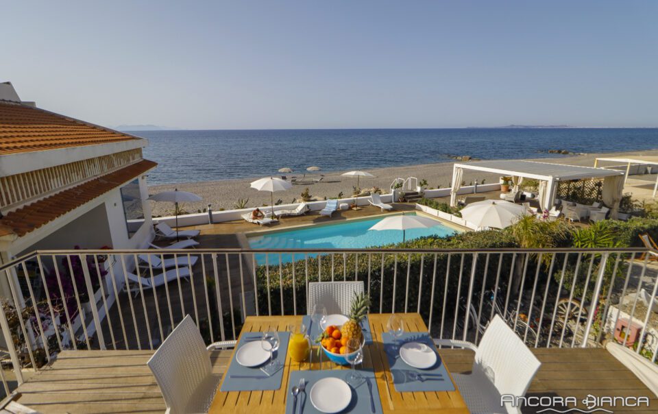 Trilocale con terrazza sul mare e piscina, una camera matrimoniale ed una camera con due letti singoli, un bagno, cucina soggiorno con divano letto matrimoniale.