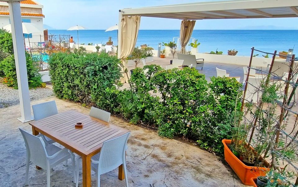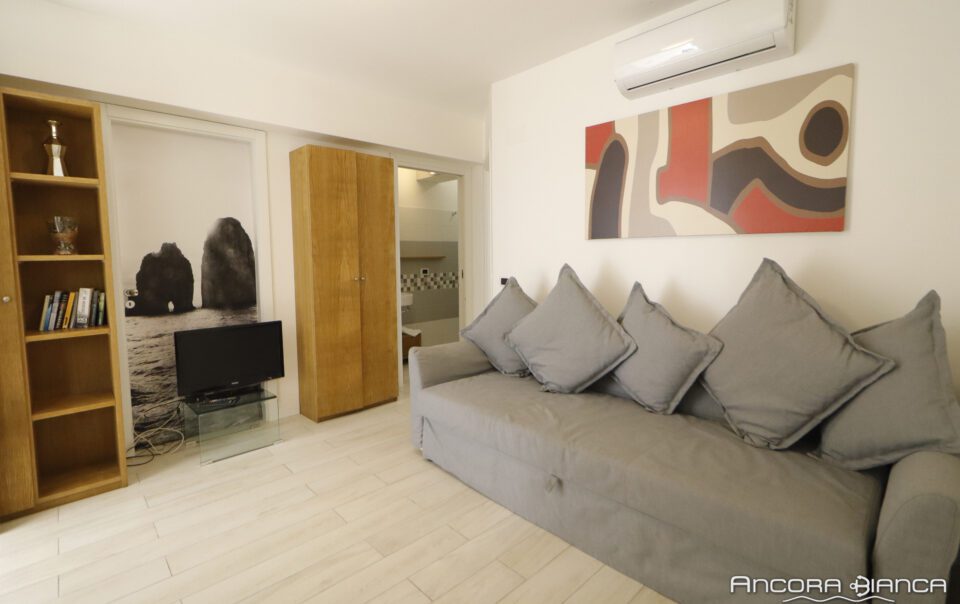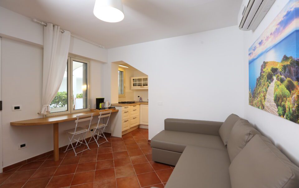Bilocale con veranda vista mare, una camera matrimoniale, un bagno, cucina soggiorno con divano letto matrimoniale.