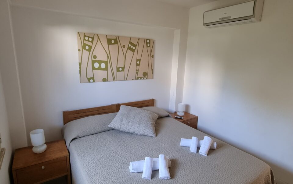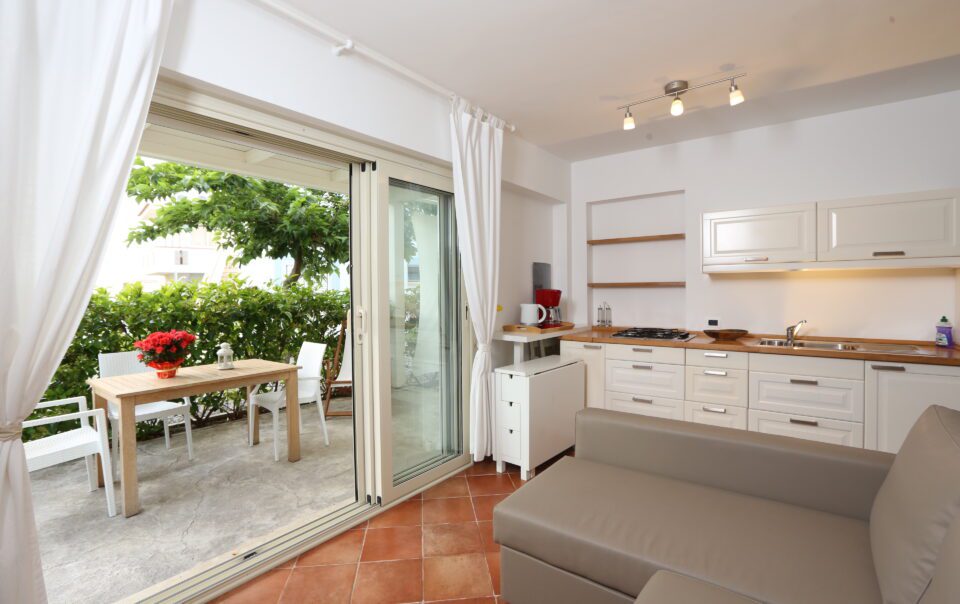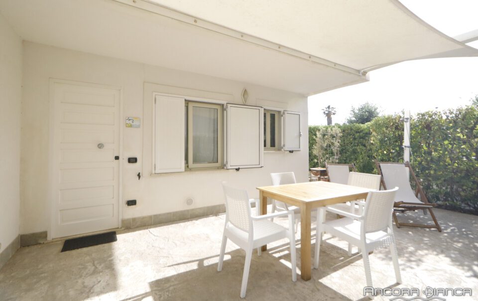 Bilocale con veranda in seconda fila, una camera matrimoniale, un bagno, cucina soggiorno con divano letto matrimoniale.