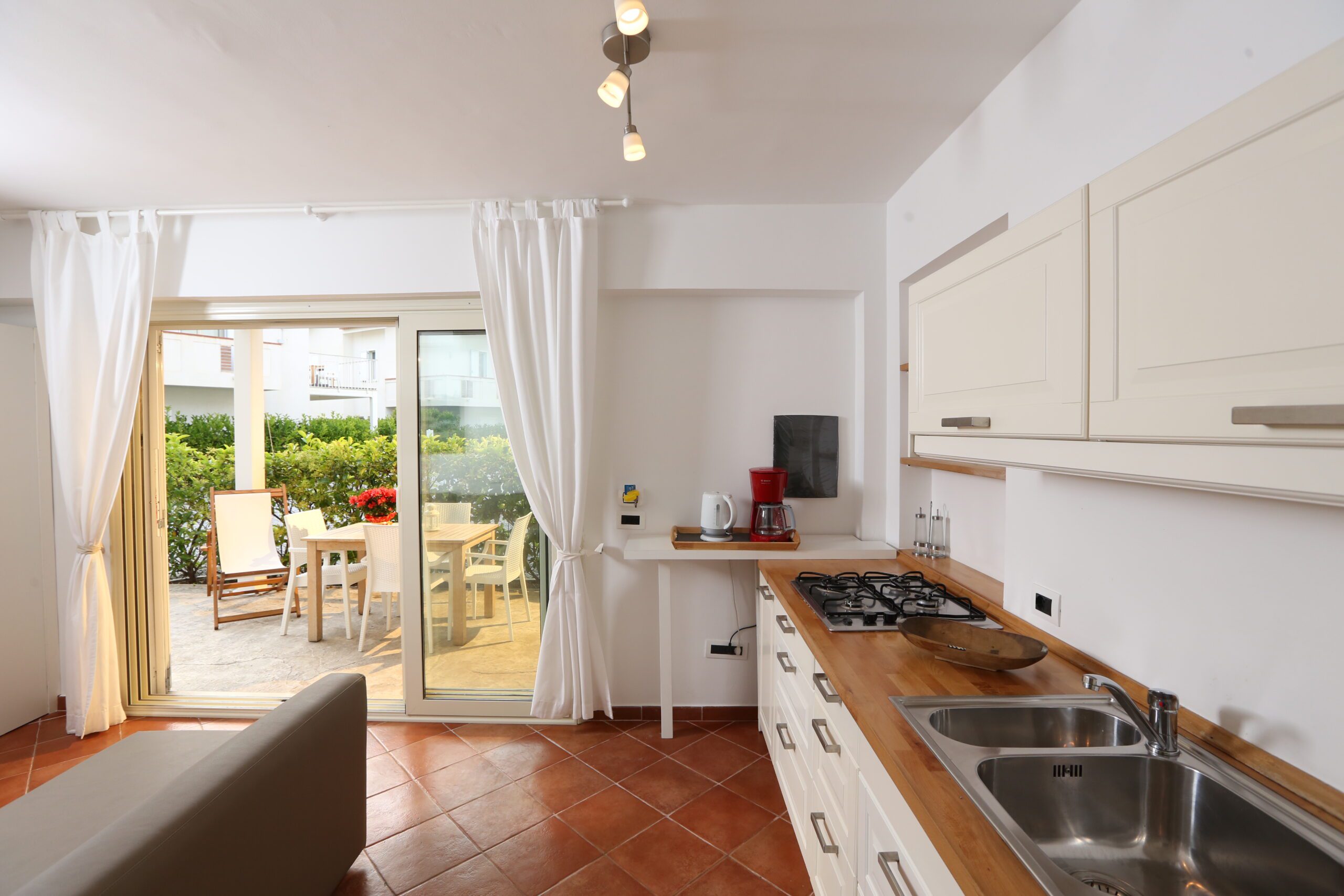 Appartamento piano terra dotato di una camera da letto matrimoniale, un bagno finestrato con box doccia, angolo cottura attrezzato e penisola con sgabelli, soggiorno accessoriato di divano letto matrimoniale con parete attrezzata, affacciato su un'ampia veranda esterna dotata di tavolo e quattro sedie, uno sdraio-lettino.
